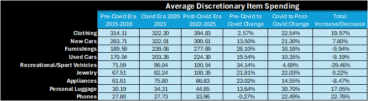 Meanwhile, during COVID, discretionary goods spending actually rose in most categories (except phones), as people redirected their budgets toward recreational items. But as we’ve transitioned out of that era, we’re now seeing a decline in spending on physical items, particularly in categories like recreational and sport vehicles—ATVs, UTVs, dirt bikes, and so on.